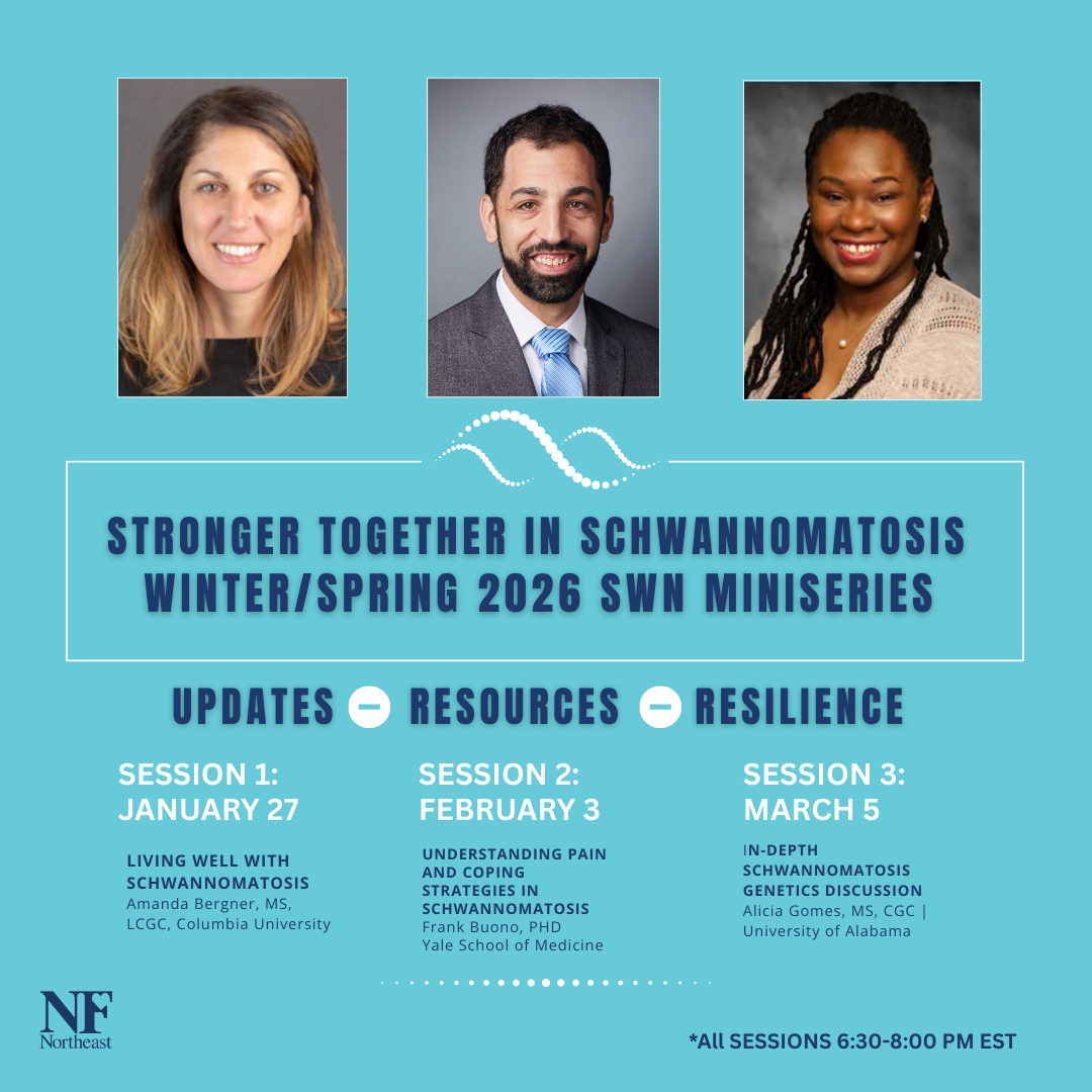 NF Northeast is hosting a three-part miniseries that delves into topics related to our schwannomatosis (SWN) community. SWN experts will shed light on the importance of well-being, pain management, and understanding in-depth genetics for individuals living with schwannomatosis. Join us for one or all of these engaging discussions.