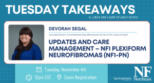 November 4th – Devorah Segal, Associate Director of the Comprehensive Neurofibromatosis Center at NYU Langone Health, will discuss the latest guidelines and therapies for plexiform neurofibromas.