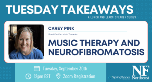 September 30th – Carey Pink, Board Certified Music Therapist, will be sharing information on the neurological and psycho-social benefits of music therapy for individuals living with NF.